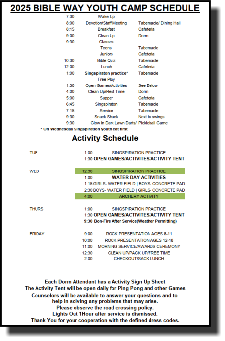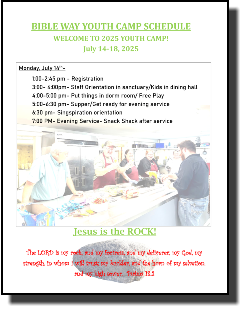 Campground Spring Cleaning Day -March 28, 2026- REGISTER HERE TODAY! Youth Camp      July 13-17, 2026 ‘26 WELCOME !